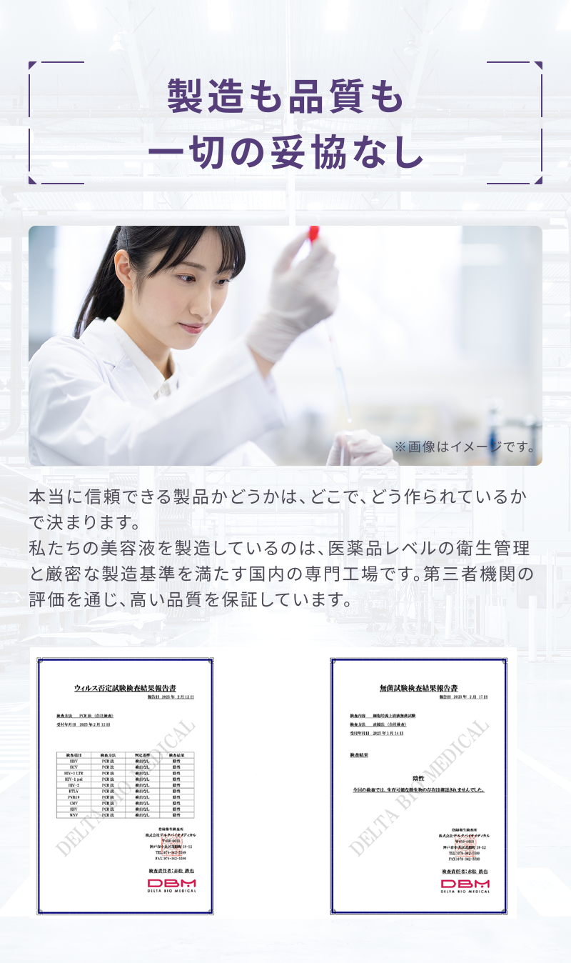 ※保湿・整肌を目的に、美容成分を配合。アスペルギルス培養物、BG、ヒトサイタイ間葉幹細胞順化培養液、ヒト脂肪由来間葉系細胞エクソソーム、グリセリン、ペンチレングリコール、ナイアシンアミド、3-O-エチルアスコルビン酸、ジ酢酸ジペプチドジアミノブチロイルベンジルアミド、バチルス/(コメヌカエキス/ダイズエキス)発酵液、ローズマリー葉油、ラベンダー油、上記成分で95%以上。