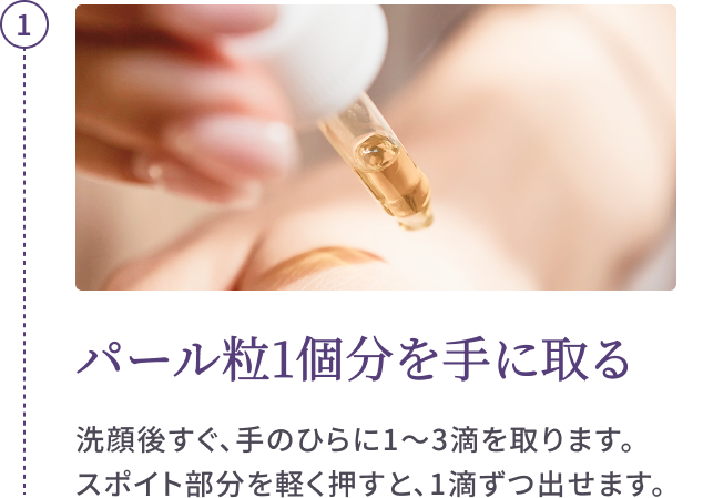 スポイトで1回分(顔全体で100円玉大)を目安にご使用ください。乾燥が気になる部分には重ね付けも可能です。