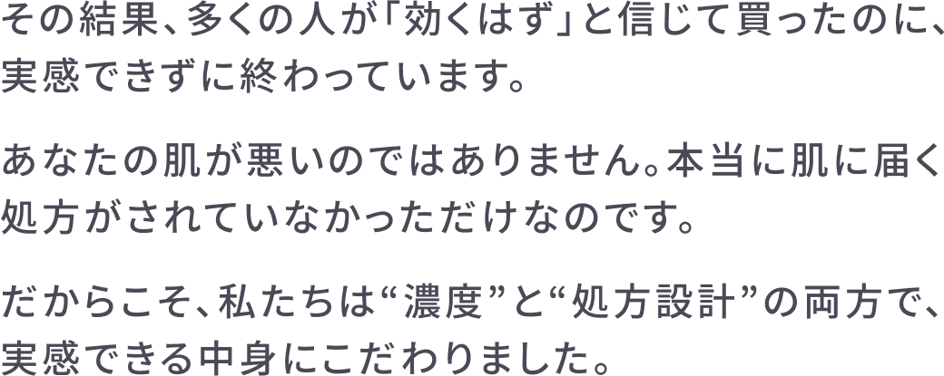 パッチテスト済みの処方ですが、すべての方に肌トラブルが起こらないわけではありません。ご使用前に腕の内側などで試し、異常がなければ顔全体にお使いください。