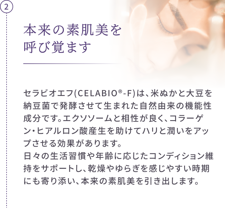 ※CELABIO®-F(バチルス/(コメヌカエキス/ダイズエキス)発酵液):保湿・整肌成分として、肌にハリとツヤを与え、すこやかな状態を保ちます。