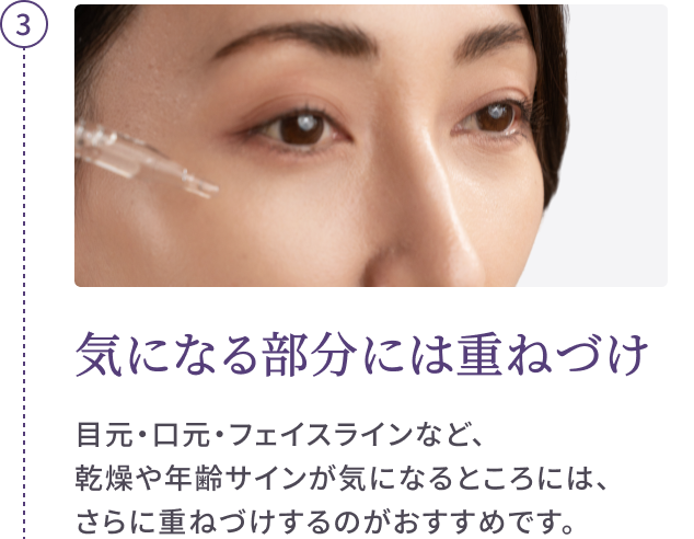 スポイトで1回分(顔全体で100円玉大)を目安にご使用ください。乾燥が気になる部分には重ね付けも可能です。