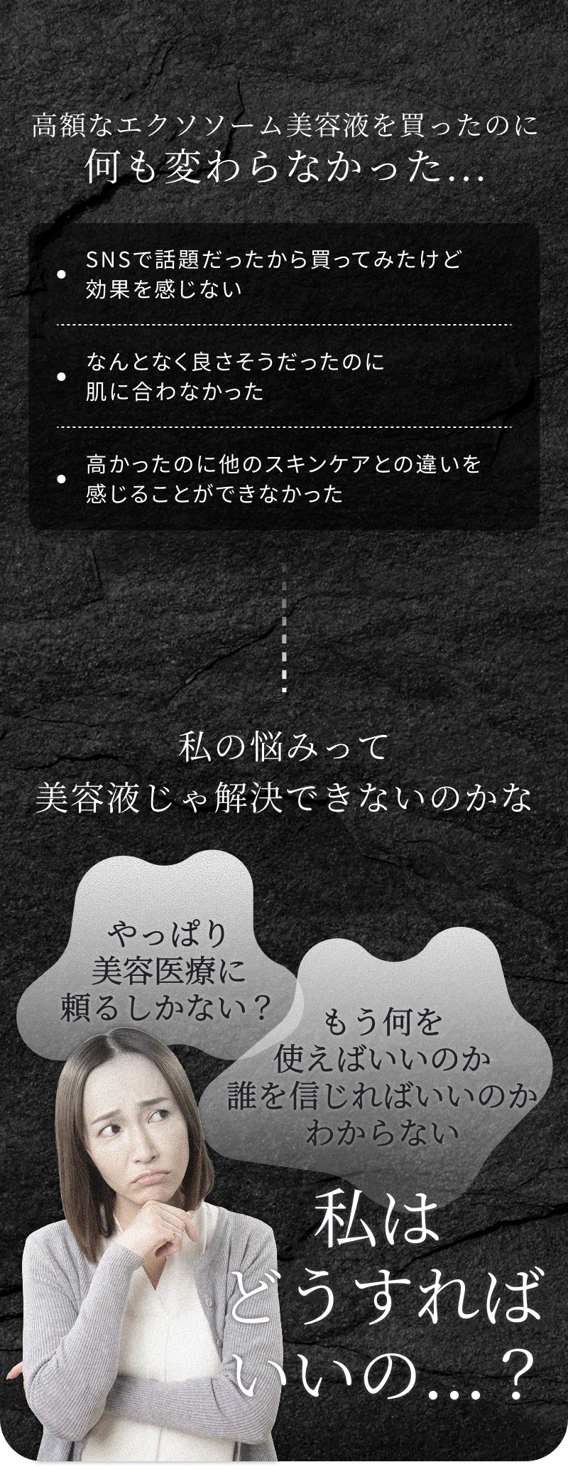 アスペルギルス培養物、BG、ヒトサイタイ間葉幹細胞順化培養液、ヒト脂肪由来間葉系細胞エクソソーム、水、グリセリン、ペンチレングリコール 、ナイアシンアミド、3-O-エチルアスコルビン酸、ジ酢酸ジペプチドジアミノブチロイルベンジルアミド、バチルス/(コメヌカエキス/ダイズエキス)発酵液、キサンタンガム、ローズマリー葉油、ラベンダー油、ラウリン酸ポリグリセリル-10、クエン酸、クエン酸Na、フェノキシエタノール、キャリーオーバー エタノール