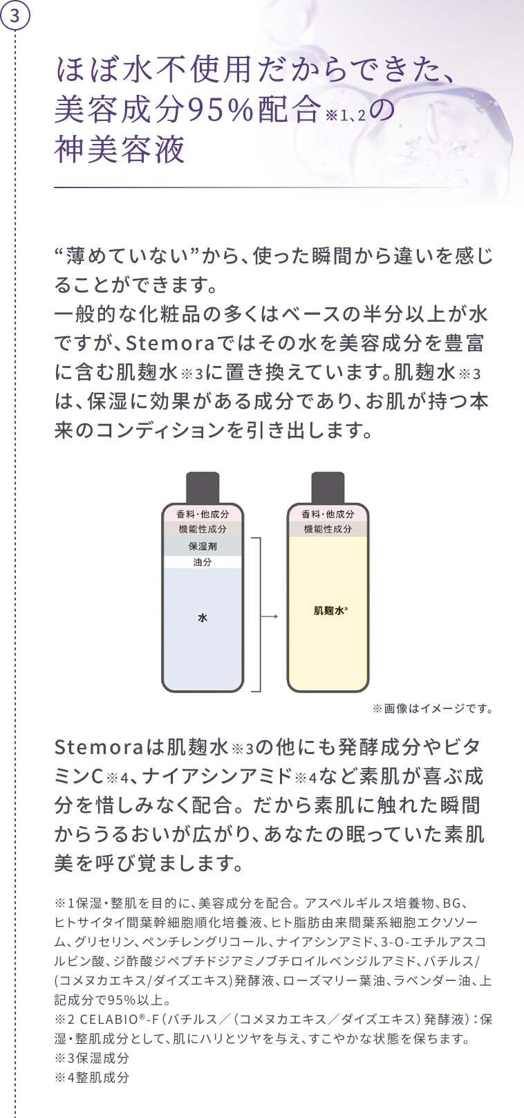 ※CELABIO®-F(バチルス/(コメヌカエキス/ダイズエキス)発酵液):保湿・整肌成分として、肌にハリとツヤを与え、すこやかな状態を保ちます。